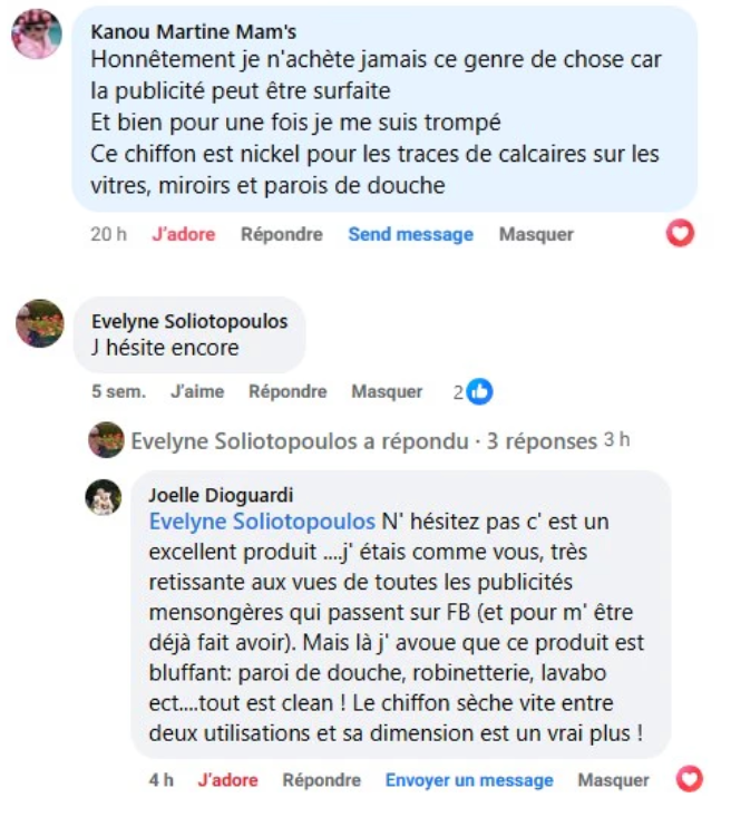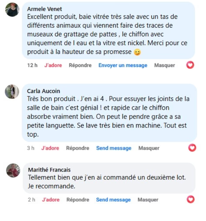 "J'étais assez sceptique avant de commander car avec les pubs sur les réseaux sociaux on ne sait jamais. Mais je me suis dis pourquoi pas tester (surtout au vu de l'offre spéciale...). Et bien je tiens à vous dire qu'ils sont juste magique 😍 Ces chiffons absorbent absolument tout instantanément. Je gagne énormément de temps et ils me simplifie la vie. Je recommande !!"