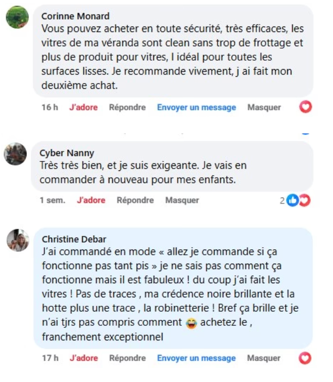 "Je suis époustouflée. Je l'ai vu sur une publicité sur Facebook et d'habitude je suis assez sceptique quant aux achats via des pubs. Mais j'ai décidé de tenter ma chance et JE SUIS TELLEMENT CONTENTE DE L'AVOIR FAIT. Le Velora Clean a véritablement révolutionné mon nettoyage quotidien. Il absorbe tout en un seul passage, même les plus gros dégâts, et laisse les surfaces impeccables sans effort."